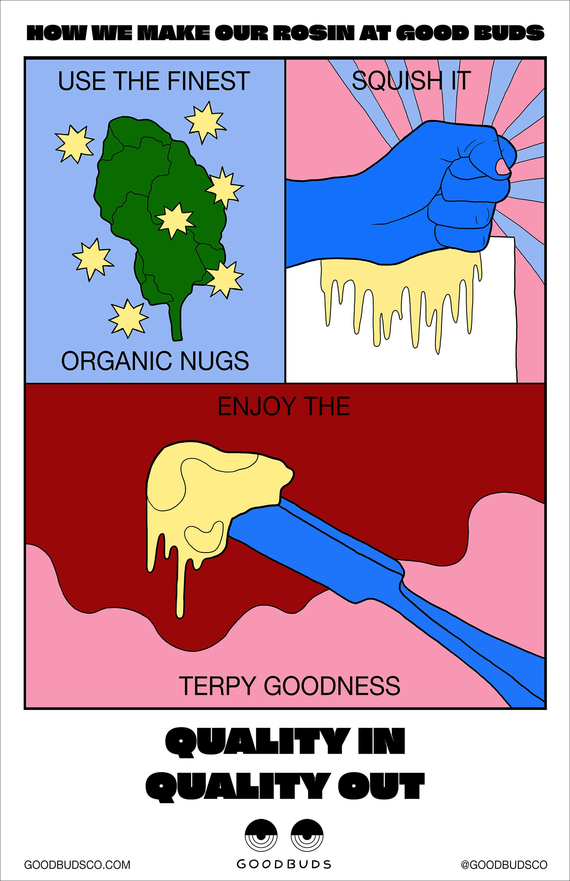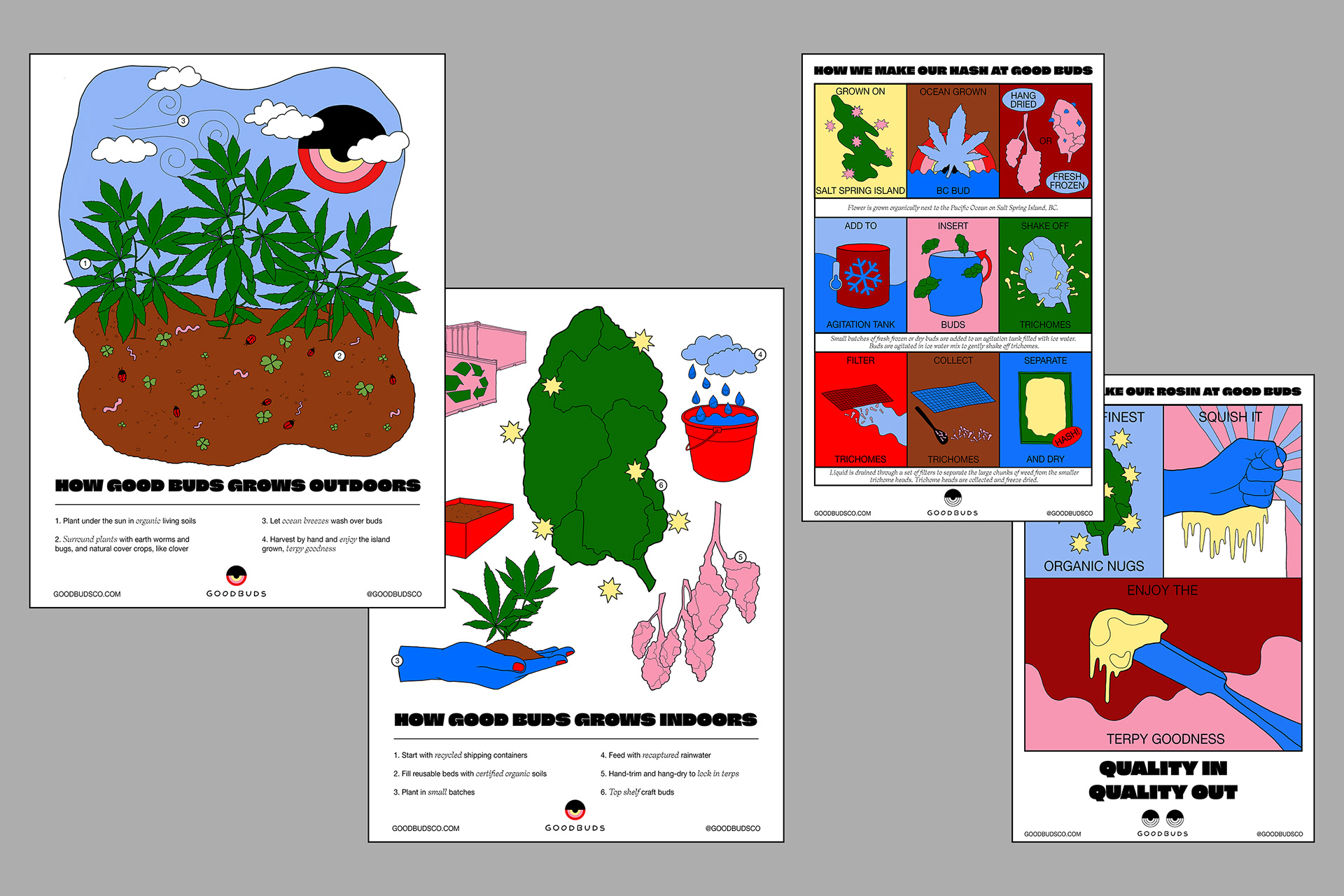 Family-owned, lovingly grown: Good Buds is a passionate purveyor of quality craft cannabis on Salt Spring Island. We created this 4-part poster series to balance the brand's spirited voice with the 6-star facts: outlining how their indoor and outdoor processes that produce the highest quality hash and rosin.
