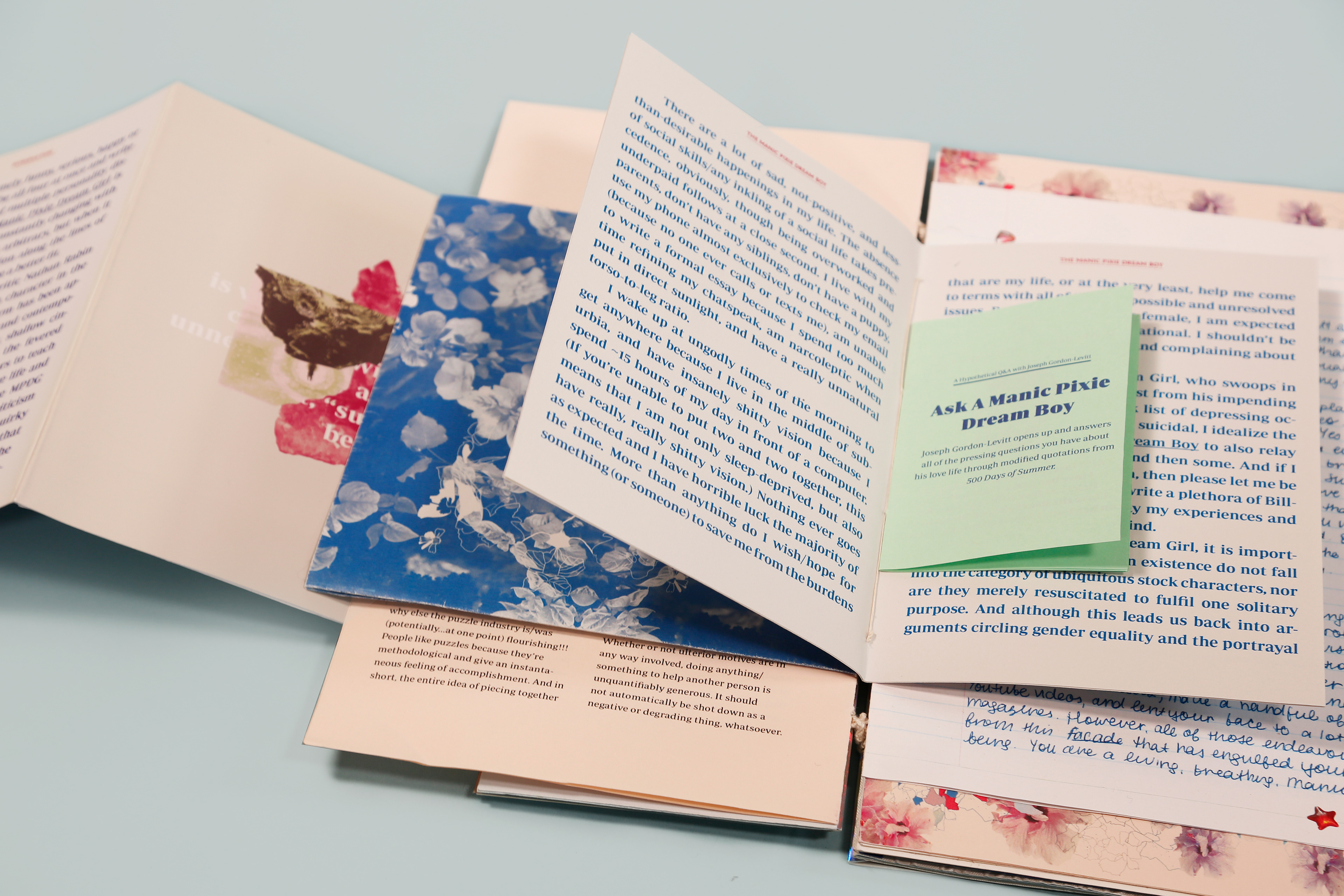 This hand-bound book investigates and challenges the Manic Pixie Dream Girl trope in film. The MPDG - which is often written for the sole purpose of helping a male protagonist self-actualize - these characters are often portrayed as vapid, and are used as stepping stones or supportive props - not actual characters. This trope is an alternative look at the male gaze, and reinforces the continued necessity to write independent female characters that exist for larger purposes than their male counterparts. My book is a tongue-in-cheek critique of this notion, and beyond it's physical form - a design artifact, it exists to question and probe pre-fabricated gender roles. As a personal project, "Manic Pixie Dream Girl" supports a body of work that tackles identity, society, empowerment, and culture.