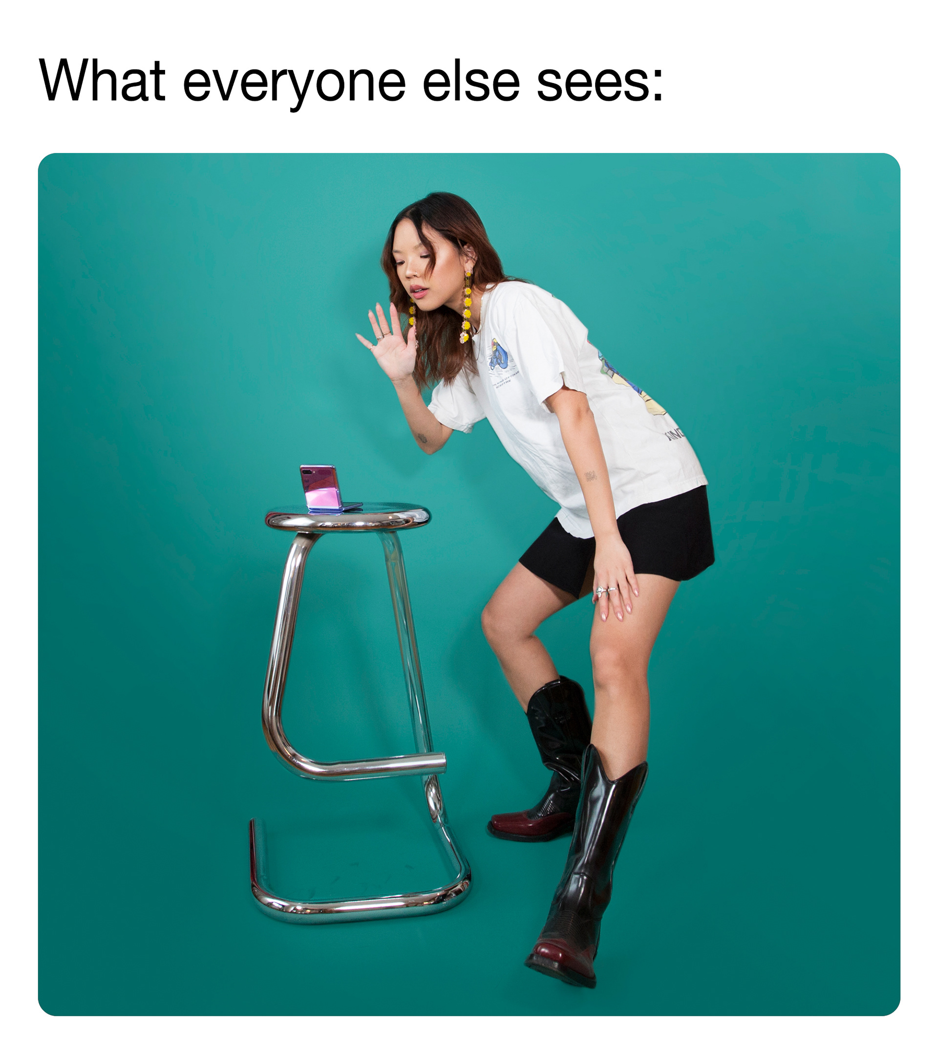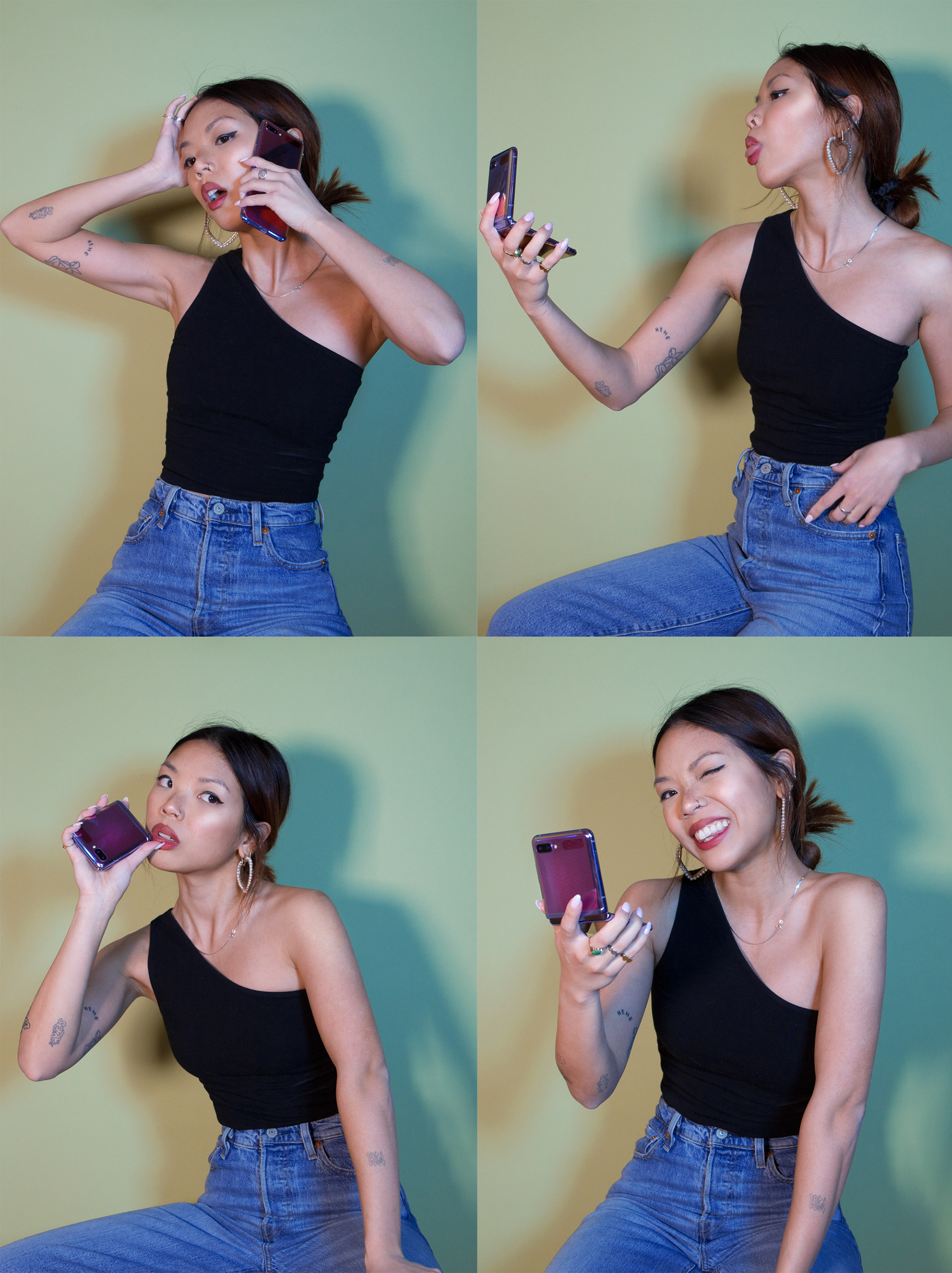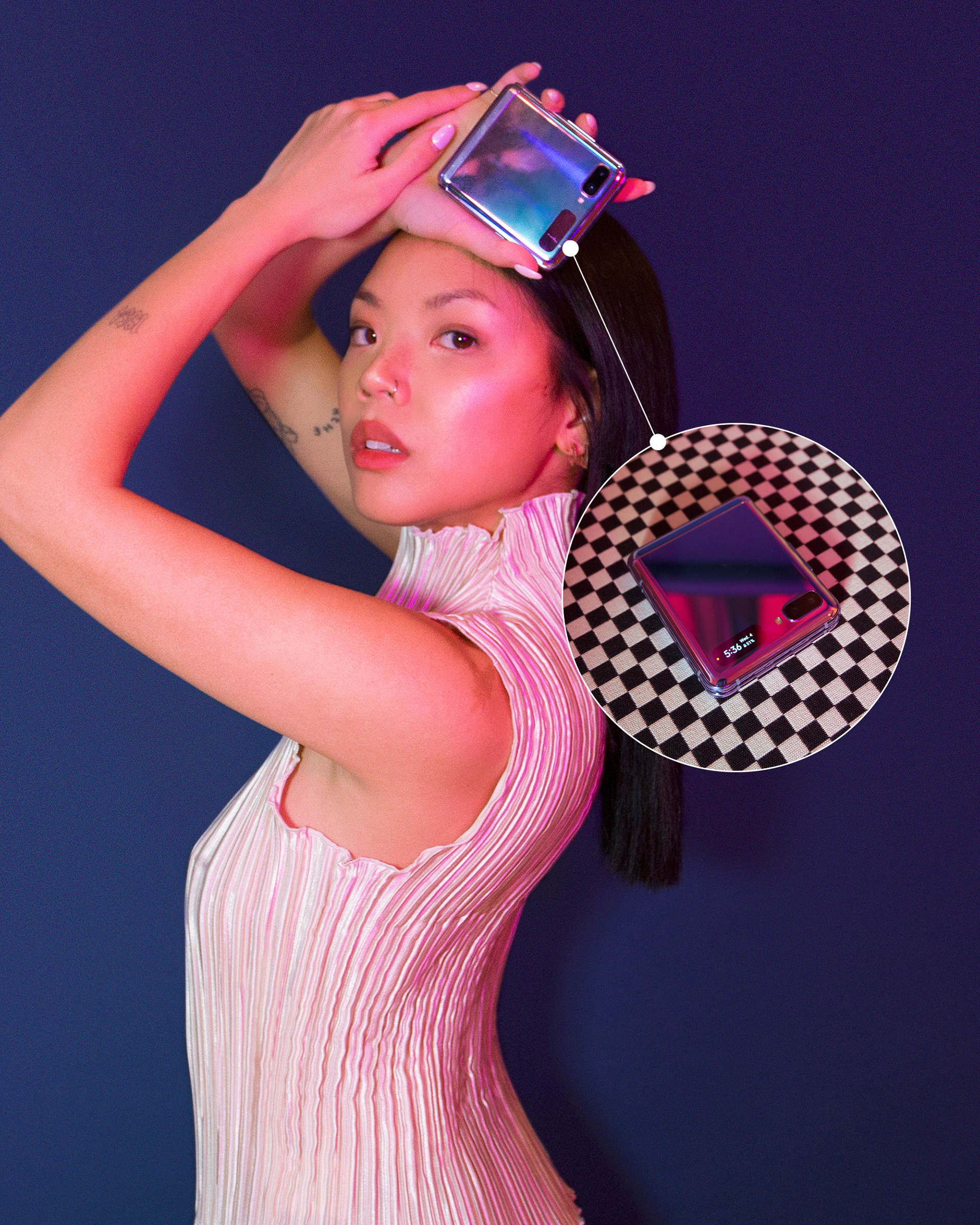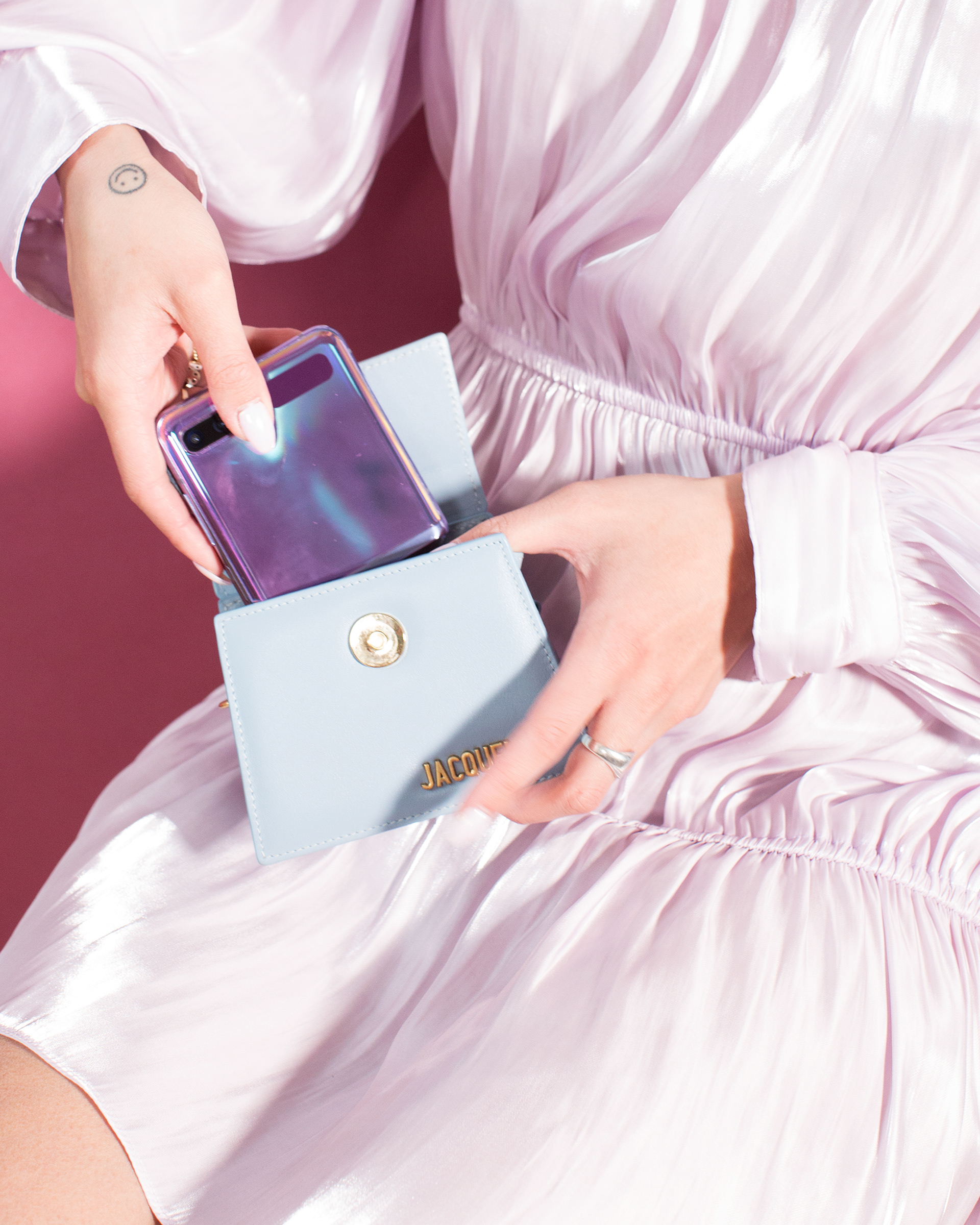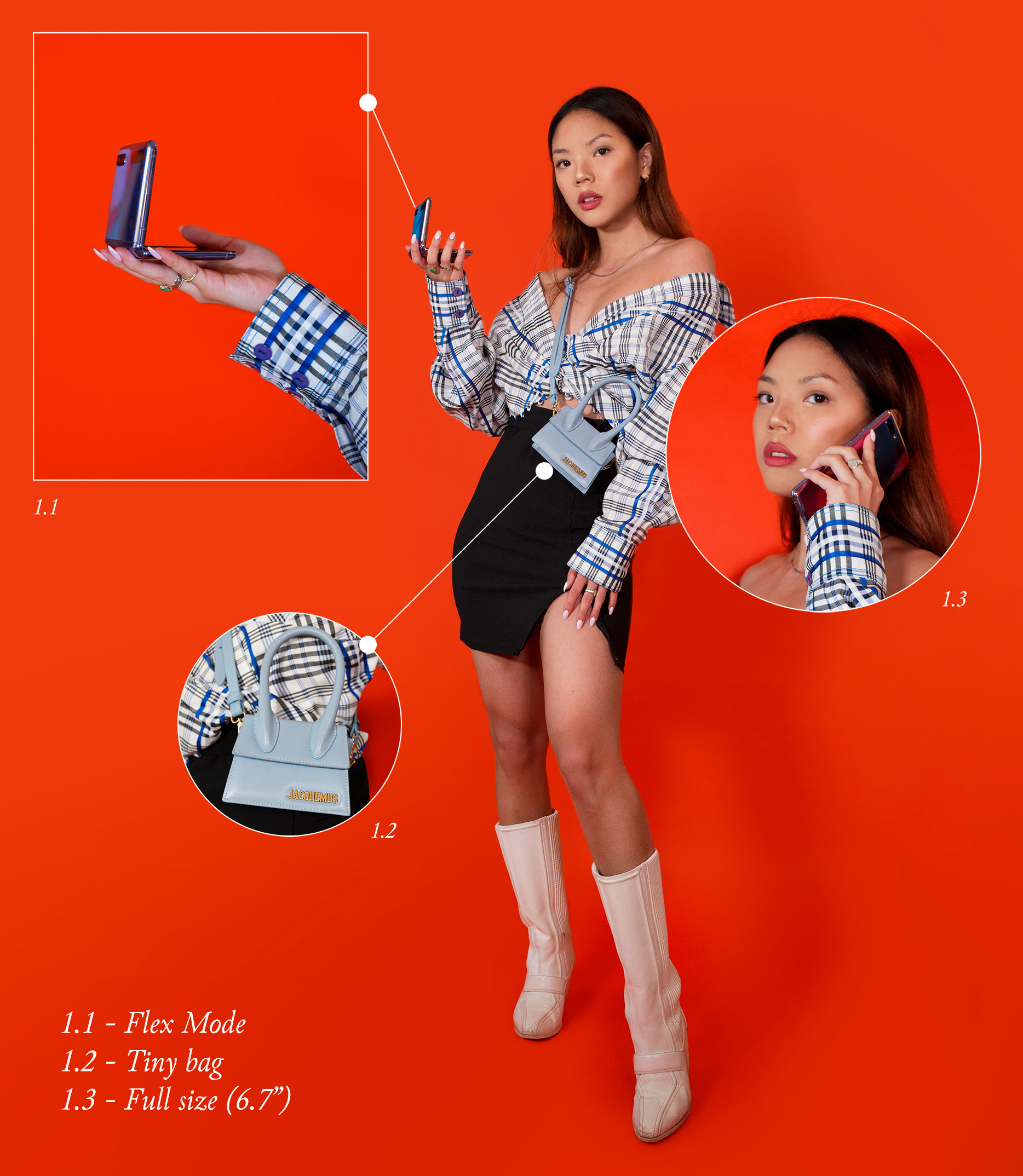 Social content to celebrate the launch of the Samsung Galaxy Z Flip phone: a smartphone that features bendable glass. When folded, the device can fit into a Jacquemus Le Chiquito: but when folded out, it reveals a stunning 6.7" display.